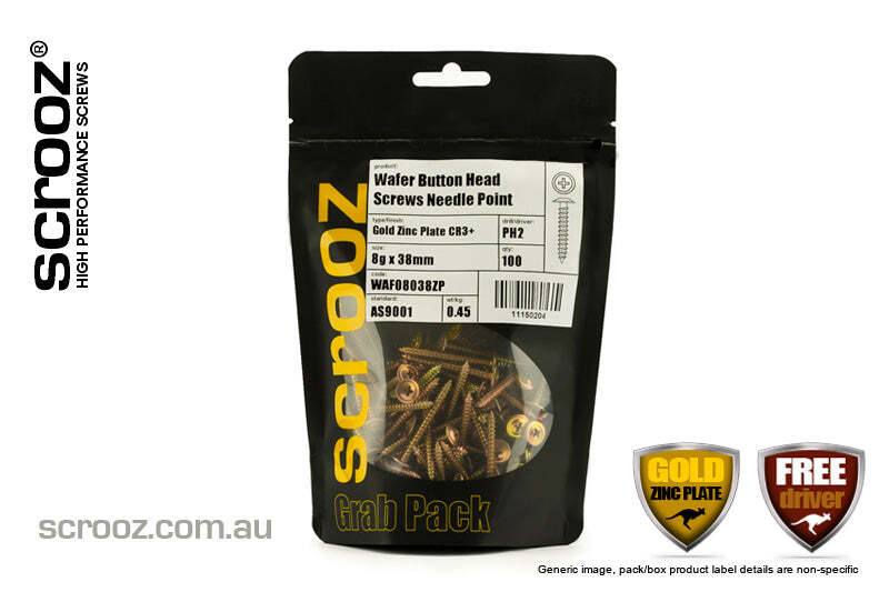 Needle point wafer button screws are generally used for a wide variety of fastening. Can be screwed directly into all timbers and thin steel framing applications, have a slim line head with a slight dome to increase driver penetration and a wide flange for max load clamping. Gold zinc finished for internal use. Free driver in every pack, box or carton.