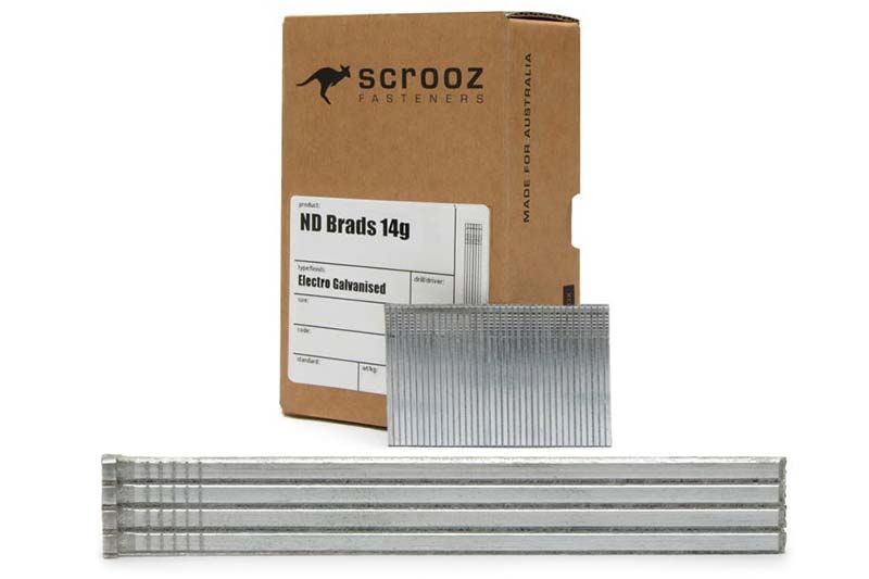 Scrooz Fasteners supplies premium ND Series Brad Nails, engineered for stronger, heavy-duty fixing where standard brads aren't enough. Our ND brad nails are 14 gauge (2.0mm diameter) with a T-shaped head and chisel point, glue-collated into strips for seamless use with all standard ND series brad nail guns. Designed for tough internal applications, they deliver exceptional holding strength across window reveals, flooring, fascias, door jambs, light framing, and general fix-outs.
